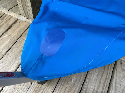 A squirrel chewed a hole in one of our Sunfish covers, we repaired it with 2 pieces of adhesive backed Challenge sailcloth from Sailrite. When we have time we'll throw a zig zag switch around the edge.